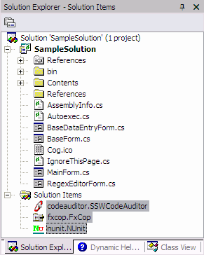 SSW Code Auditor, NUnit and Microsoft FxCop are tools to keep your code "healthy". That is why they should be easily accessible in every solution so that they can be run with a double click of a mouse button.