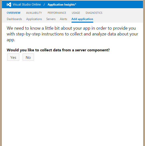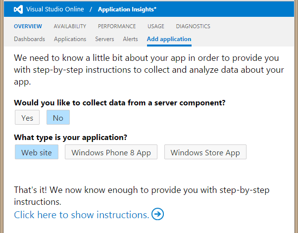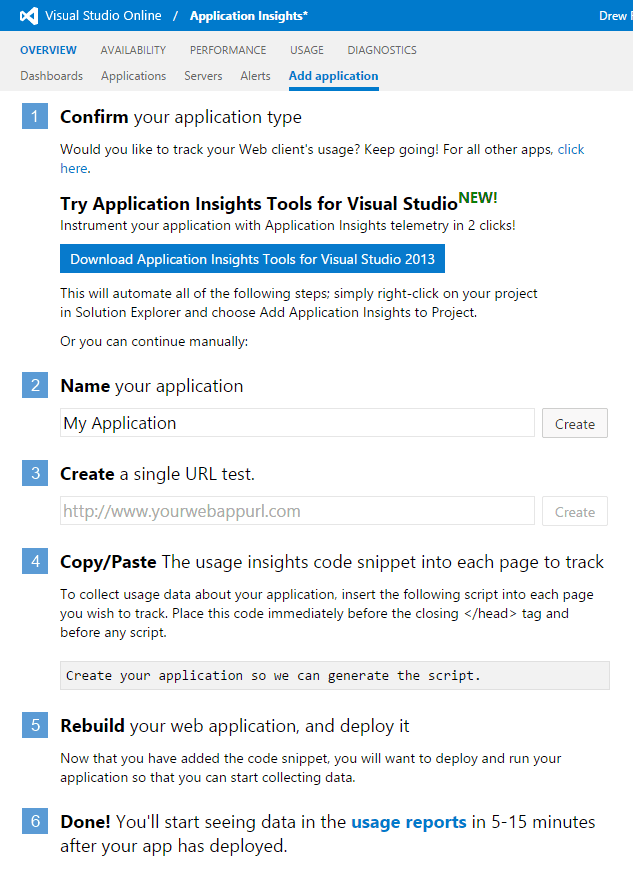Figure: Sign into Visual Studio Online, and navigate to Application Insights | Add Application
