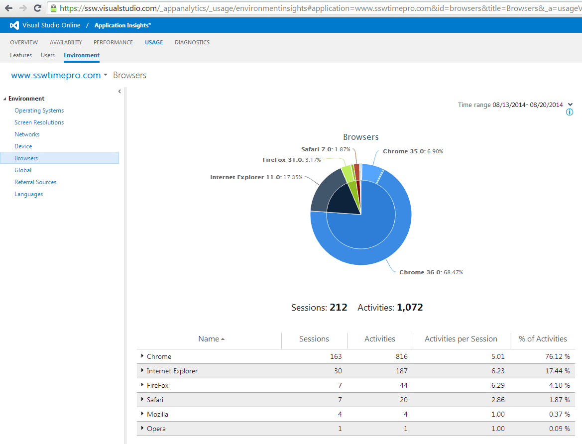 Last updated by Brady Stroud [SSW] over 1 year ago.See historyApplication Insights for Visual Studio Online gives you a great insight into how, when and where your website is used.
