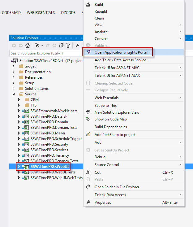 Figure: Now when you right-click on your web project there is a new option Open Application Insights Portal...