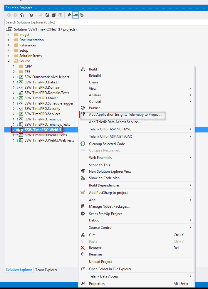 (Add Application Insights Telemetry to Project... not displaying? See instructions at the end of this rule)