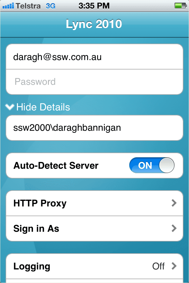 - Set up Lync to sign into your account as follows:
