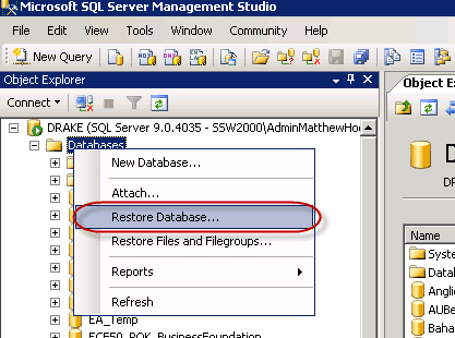 - In SQL Server Management Studio right click on Databases | Restore Database...