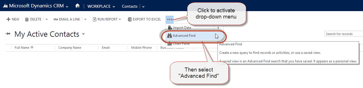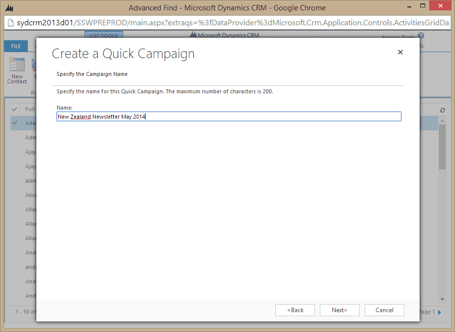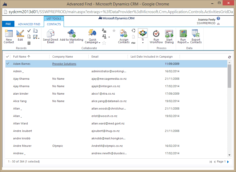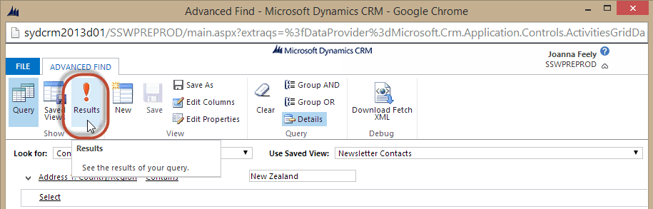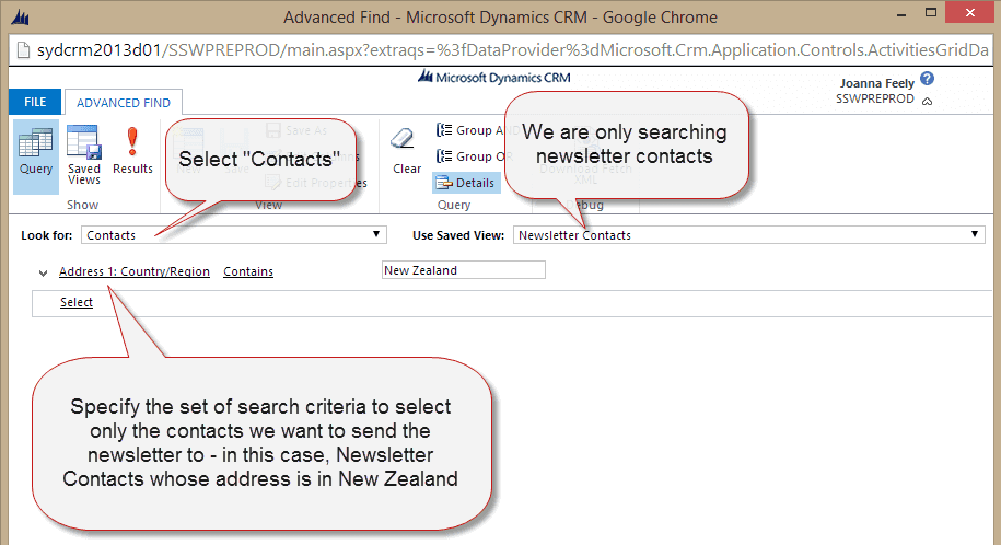 The first time - use Advanced Find in CRM 2013, then save it as a System View. In the example below, we're only interested in New Zealand contacts. Subsequent times - Use the System View , so everyone is using the same list.