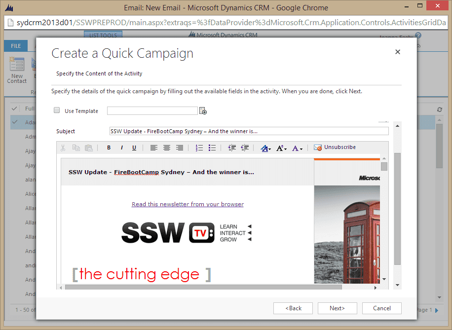 Last updated by Brady Stroud [SSW] over 1 year ago.See historyEmail newsletters can be sent and responses can be tracked using Microsoft Dynamic CRM 2013: