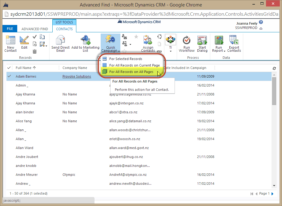 Figure: Select "For All Records on All Pages" to create a Quick Campaign from the current contact list. This will bring up a Quick Campaign Wizard