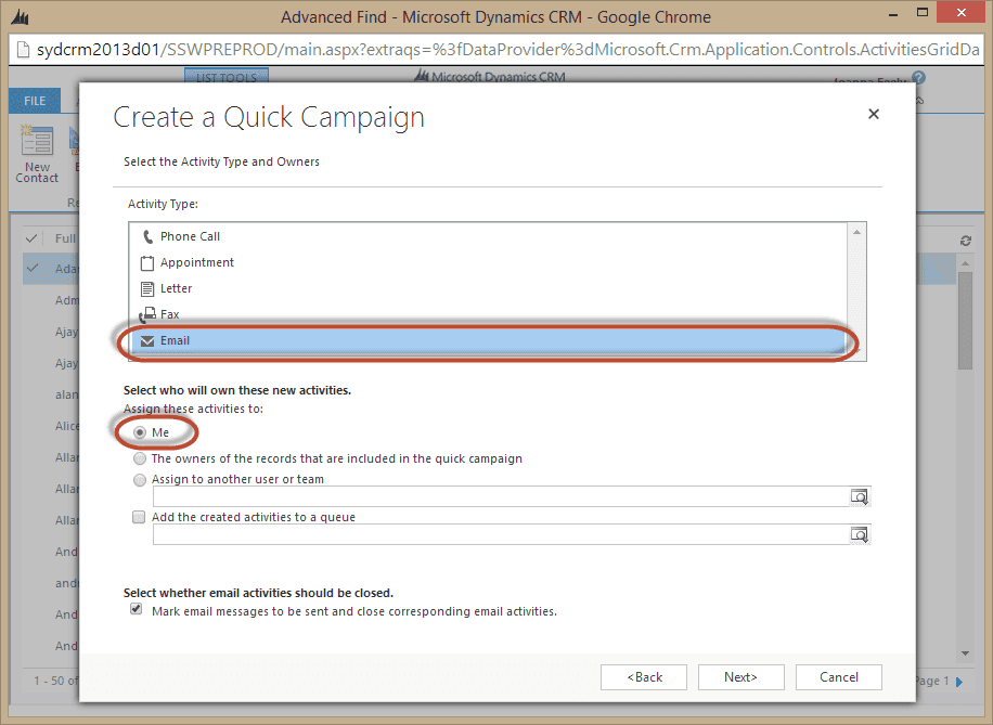 - Click Next to create all email activities in Microsoft CRM 2013. 5. Now you have to wait while the emails send out: _ Bad Example - Microsoft CRM Outlook for outgoing email, then you need to open your Microsoft Outlook, so the email activities can be promoted to Outlook and sent out. This method is slow because of the synchronization process between CRM and Microsoft Outlook and you need to leave outlook open during the entire process. _ Bad Example - Email router for outgoing email, then those email activities will be sent out automatically by Email router. This method is our preferred method of sending the newsletter, CRM email router can be configured to send out newsletters immediately and the user doesn't have to open Outlook while the emails are being processed. As per Crm tip of the day (https://crmtipoftheday.com/979/start-planning-farewell-party-for-email-router/) the email router is now deprecated * Good Example - Server side sync for outgoing email, then those email activities will be sent out automatically by server side sync. This method is our preferred method of sending the newsletter, CRM Server side sync can be configured to send out newsletters immediately and the user doesn't have to open Outlook while the emails are being processed.