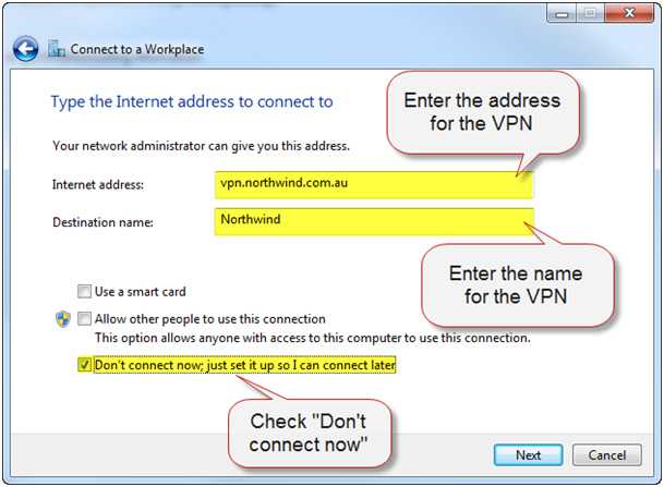 Figure 5 - Fill out "Internet Address" and "Destination Name" | Check "Don't Connect Now" 7.