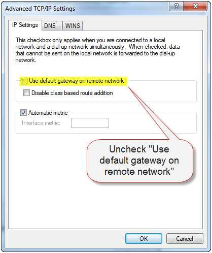 Figure 11 - Uncheck "Use default gateway on remote network" 15. Click OK on all of the open dialogs | Double click on the new VPN