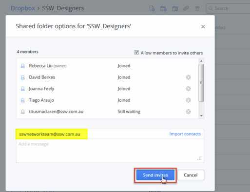 Figure: Add the email address of the company Dropbox account and click Send Invites. Once the Administrator accepts the share, your important work files will be available in the case that you leave or get hit by a bus