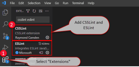 Linters for these can be easily added to VS Code via extensions. Simply select the "Extensions" tab, search for "CSSLint" and "ESLint" and click "Install" on each respectively.