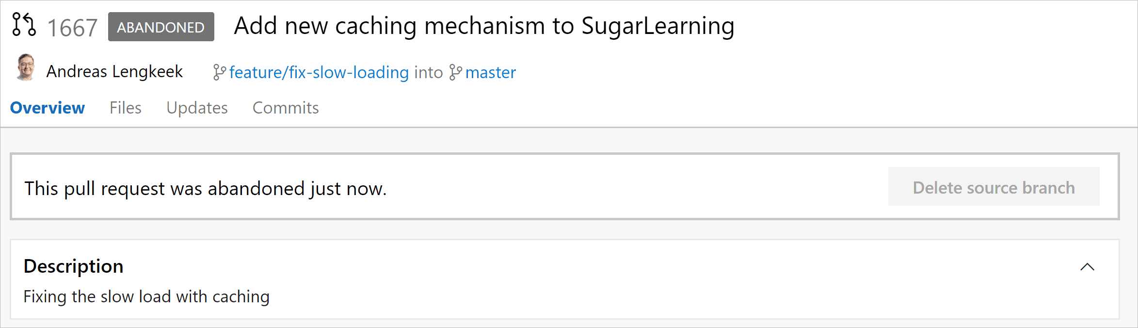 Assume you are creating a cool new feature. First you will create a new branch, create some commits, check it works, and submit a pull request. However, if you are not happy with the feature then don’t just delete the branch as normal. Instead, create a pull request anyway and set the status to Abandoned. Now, you can continue to delete your branch as normal.