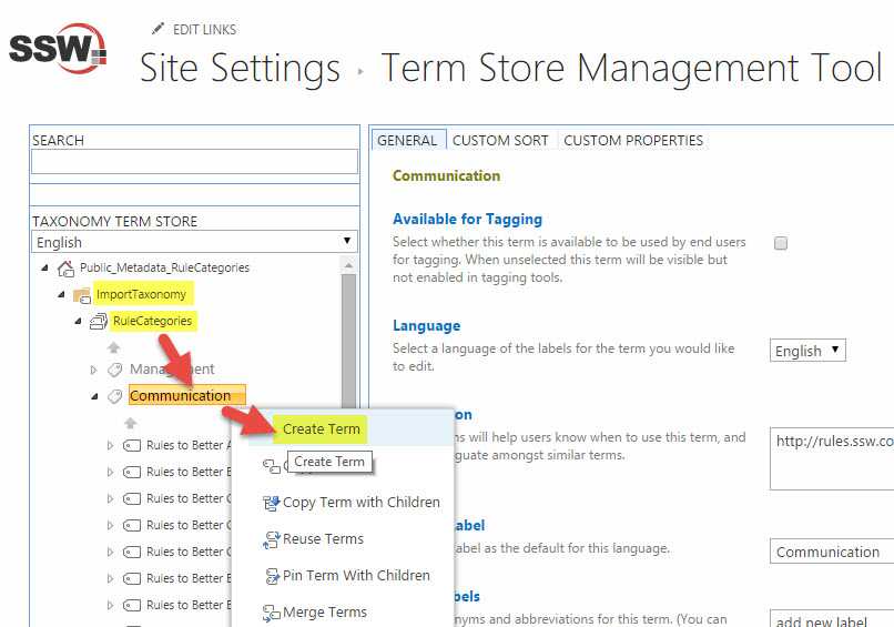 - Open termstoremanager, under "ImportTaxonomy" | "RuleCategories", find the right "parent category" (e.g. "Communication"), click "Create Term":