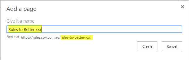 Figure: a friendly url will be automatically generated - On the new created page, go to "Ribbon" | "Page" | "Page Layout" to change the new created page layout to be "SSW - Rule Summary Page":