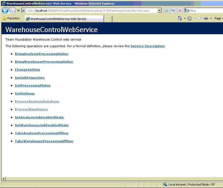 Browse to http://localhost:8080/tfs/TeamFoundation/Administration/v3.0/WarehouseControlService.asmx
