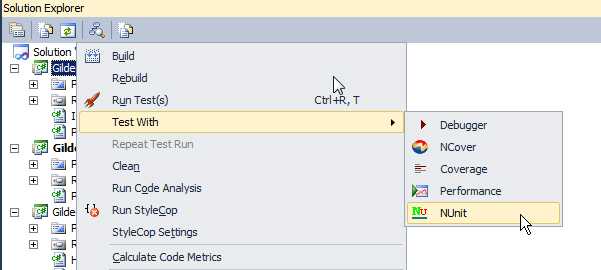 TestDriven.net has better NUnit integration – from both code and Solution Explorer windows.