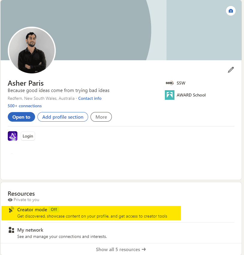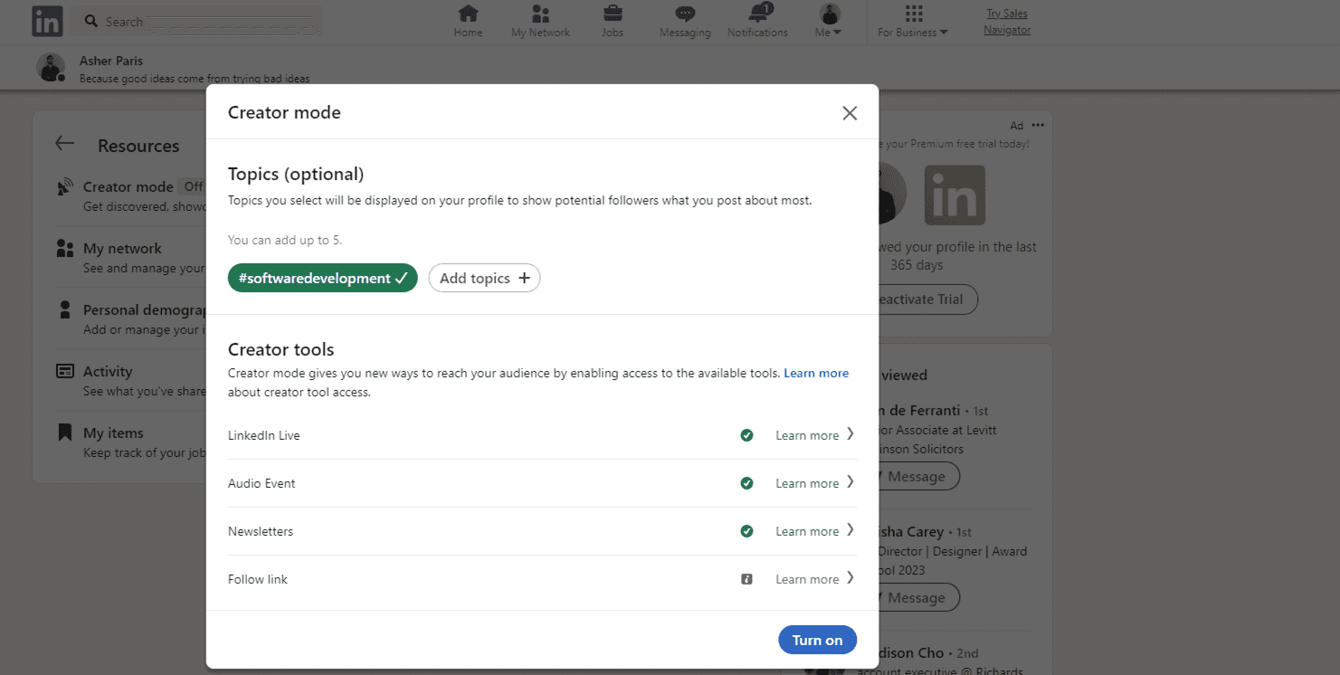 You can turn on creator mode to get access to additional tools and features that help you create content and grow your audience base on LinkedIn.
