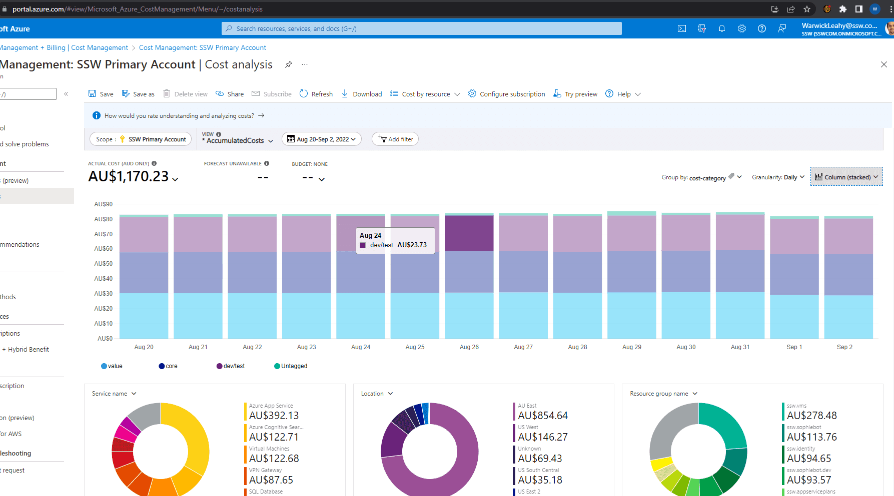 - Add a tag of cost-category to each of your resources. This will allow you to see the daily costs of your Azure resources based on whether they are Core, Value adding or Dev/Test. Then you can quickly turn off resources to save money if you require. It also helps you to see where money is disappearing.