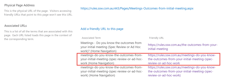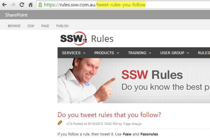 https://sharepoint.ssw.com.au/<mark>Pages/</mark>tweet-rules-you-follow<mark>.aspx</mark> - Friendly URL - e.g.