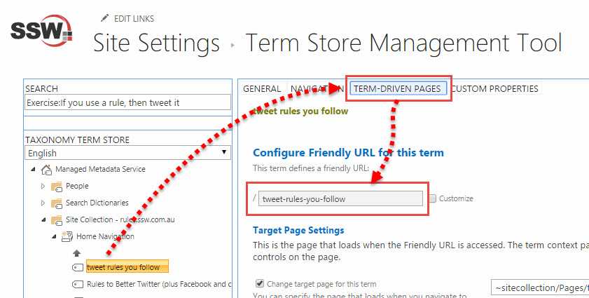 - Double click the term store item label to rename it, SharePoint will automatically convert "white space" to "-". e.g. "tweet rules you follow" will be generated with a friendly URL "tweet-rules-you-follow":