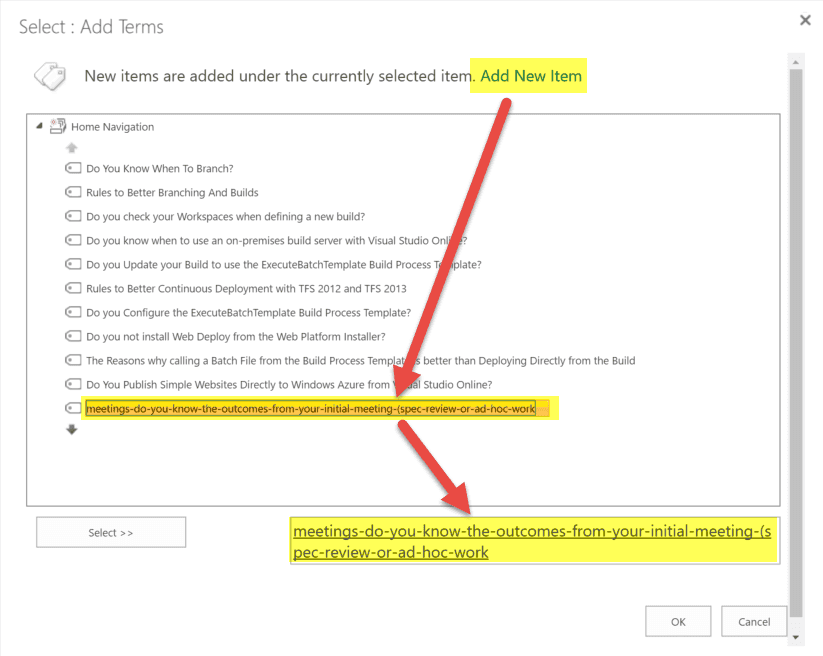 - In the "Select: Add Terms" dialog, click "Add New Item", input the old friendly URL, then double click it to ensure you select it