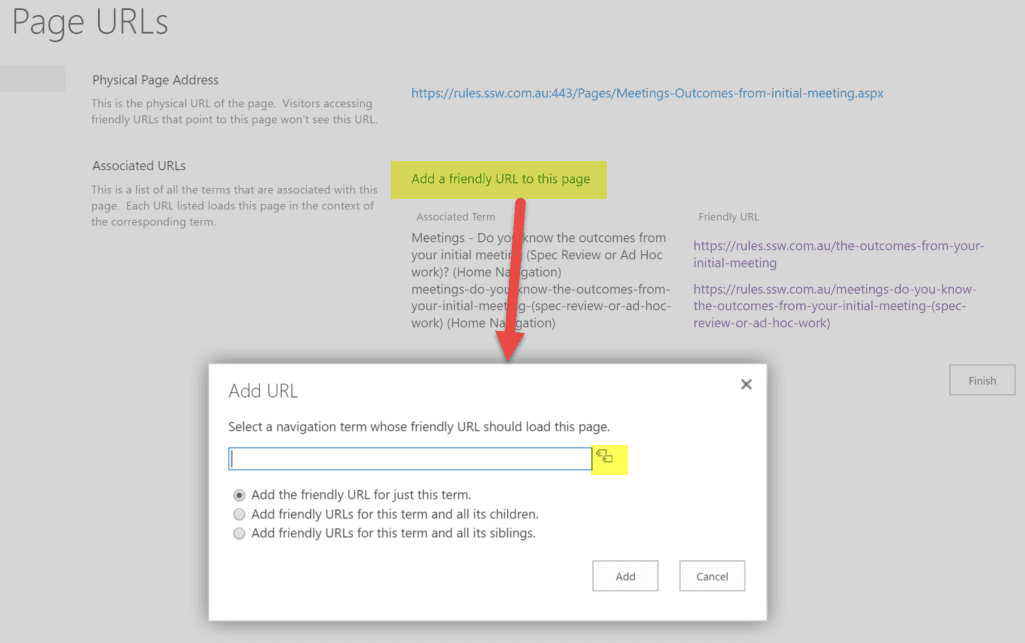 - Click "Add a friendly URL to this page", then click the 'tag' icon
