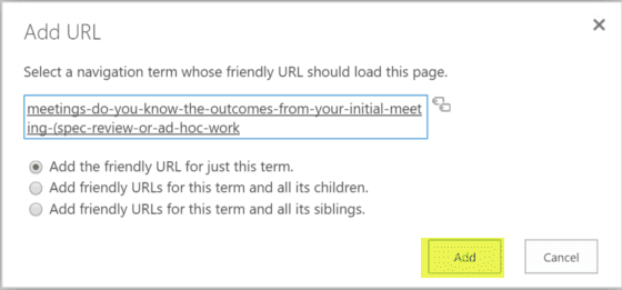 - Click the "Add" button to add the old friendly URL, it will be redirected to the new friendly URL. (TEST: In browser, open the old friendly URL to confirm it's redirected to the new friendly URL)