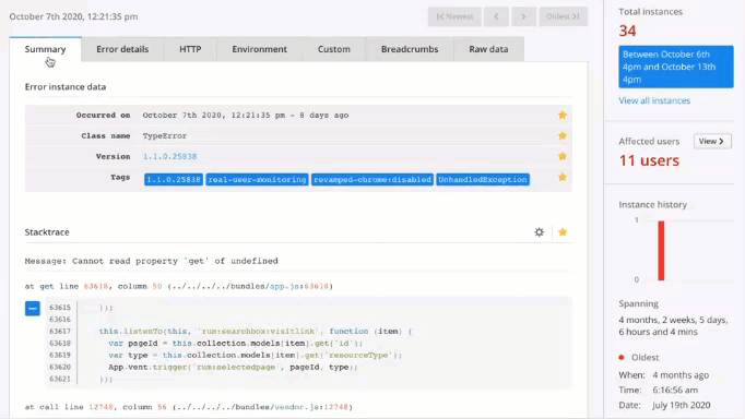 Figure: Good example - Raygun gives you lots of information about errors and the "breadcrumbs" that led the user to the error in order to help you find issues Your users should never see the “yellow screen of death”. Errors should be caught, logged and a user-friendly screen displayed to the user.