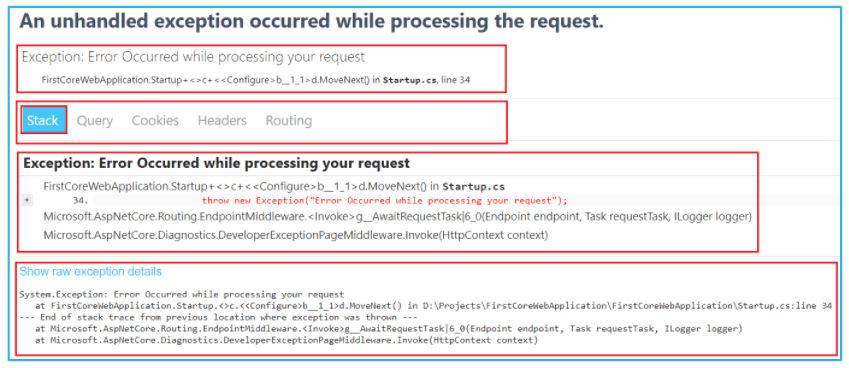 public void Configure(IApplicationBuilder app, IWebHostEnvironment env) { if (env.IsDevelopment()) { app.UseDeveloperExceptionPage(); } else { app.UseExceptionHandler("/Error"); app.UseHsts(); } ... }Find out more about exception handling in .NET Core 5 here.