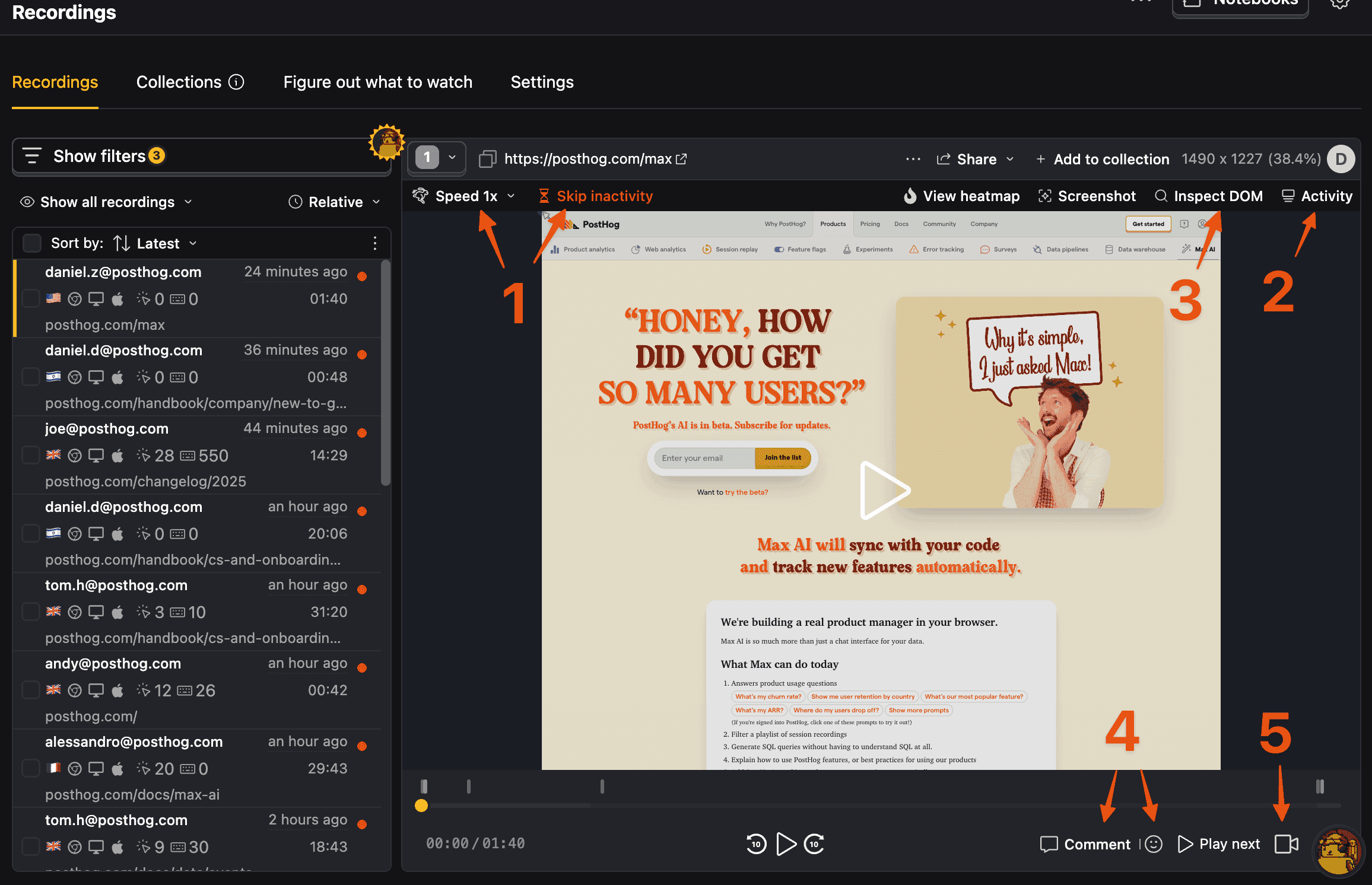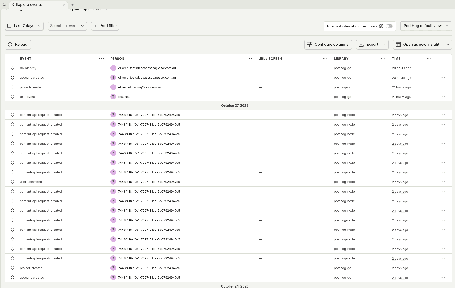 Figure: Session replay in PostHog helps you see exactly what the user experienced Event logging allows you to track any custom action in your application - from button clicks to API calls - giving you complete visibility into user behavior. Combined with user surveys, you can correlate what users do with what they think.