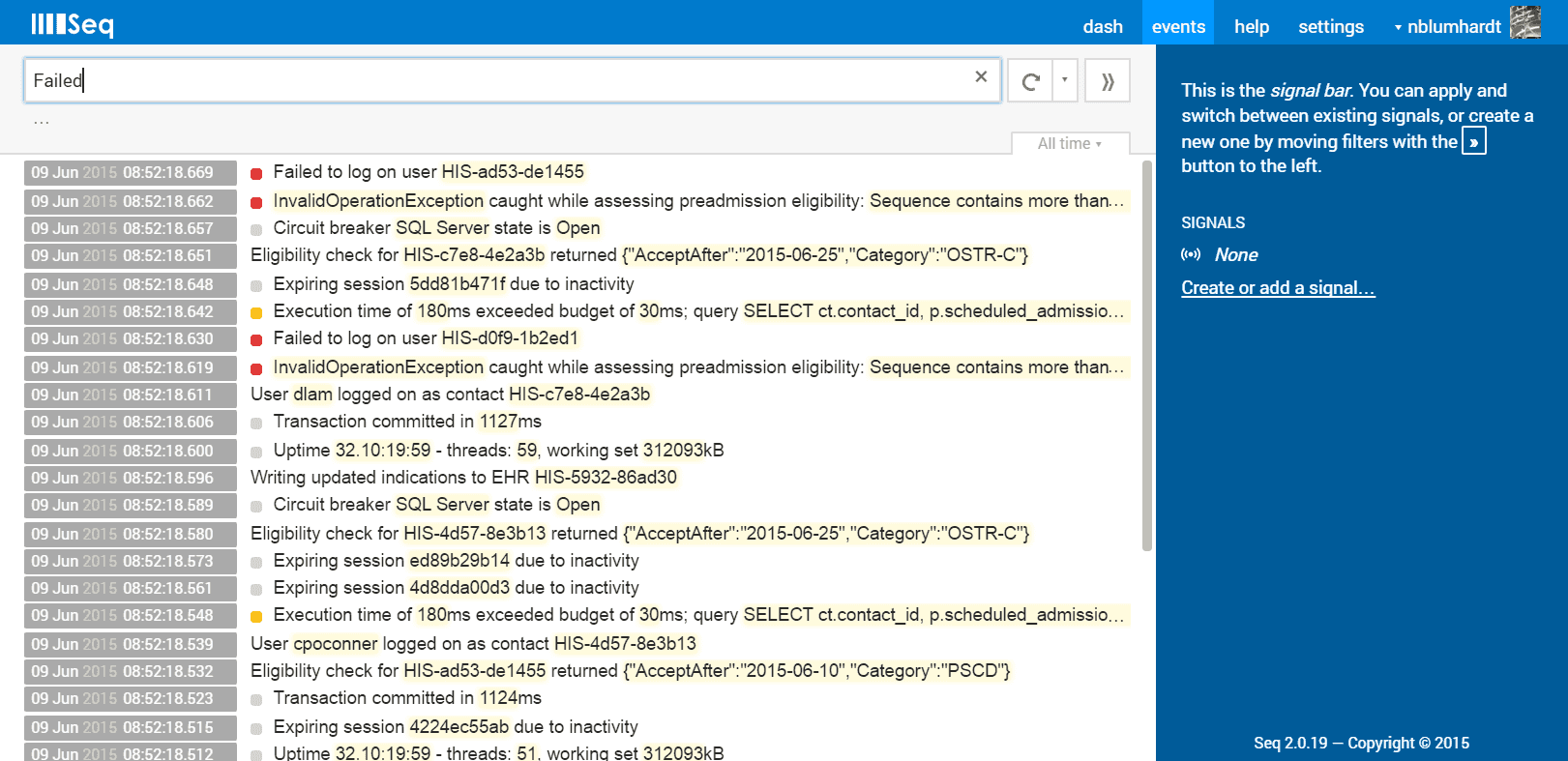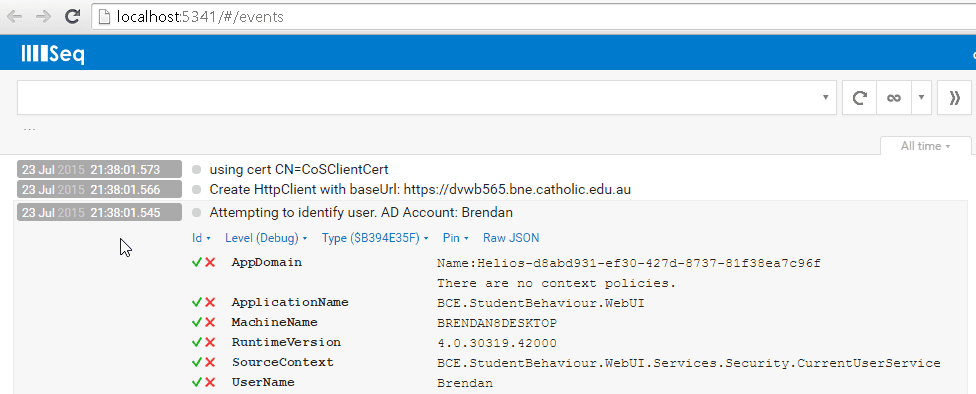 Figure: Good example - Seq provides you with plenty of details about what is happening, but if you don't already know what you're looking for, it can be tricky to parse RayGun