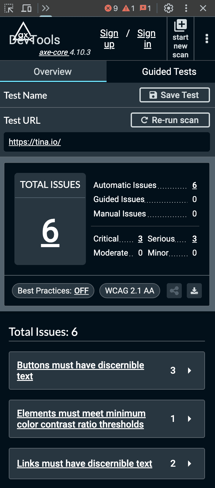 Similarly, axe DevTools is a browser extension and testing toolkit powered by axe-core, using the same accessibility engine used in Lighthouse. It is used to find and fix accessibility issues during development. However, unlike lighthouse, it allows guided and manual testing for things automation can't fully check (e.g., meaningful ink text, focus order, screen reader experience).