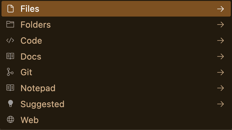 Figure: Cursor Chat Context, opened by typing `@` In Cursor, the