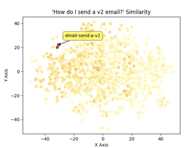 When you have an embedding for two pieces of text you can perform a mathematical operation called cosine similarity, which measures the distance between the two vectors. The closer they are, the more similar the text.