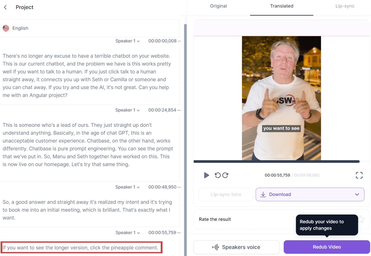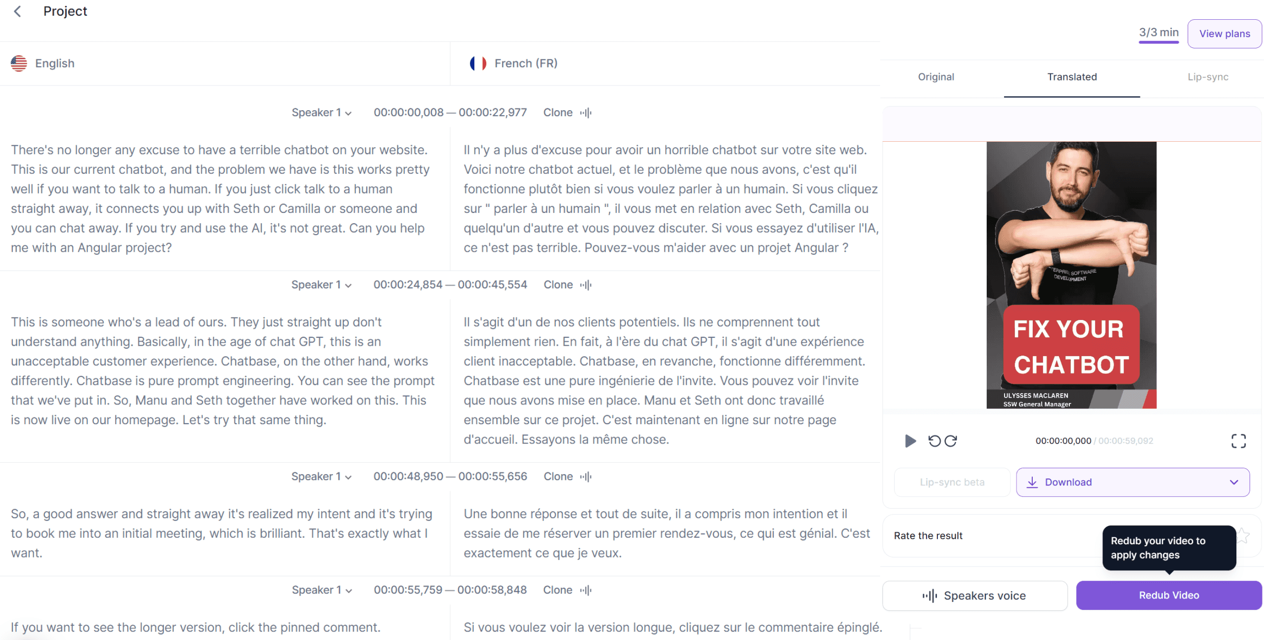 Figure: Good example - Using Rask to translate an English voiceover into French in the speakers own voice Video: Fix Your Website Chatbot! - English version (1 min)