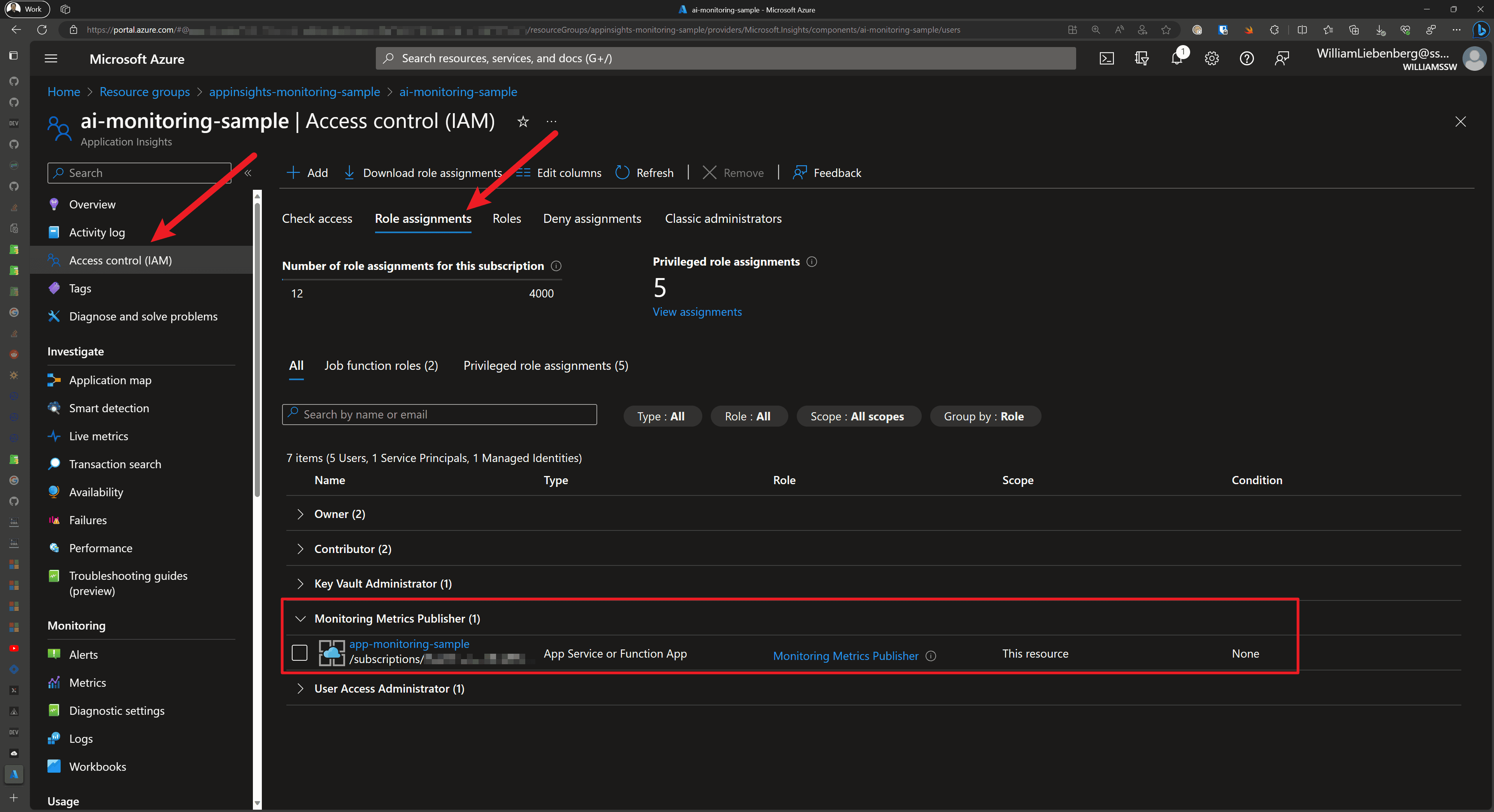 Monitoring Metrics Publisherrole to the AppService - Authenticate your application against AppInsights using a managed identity