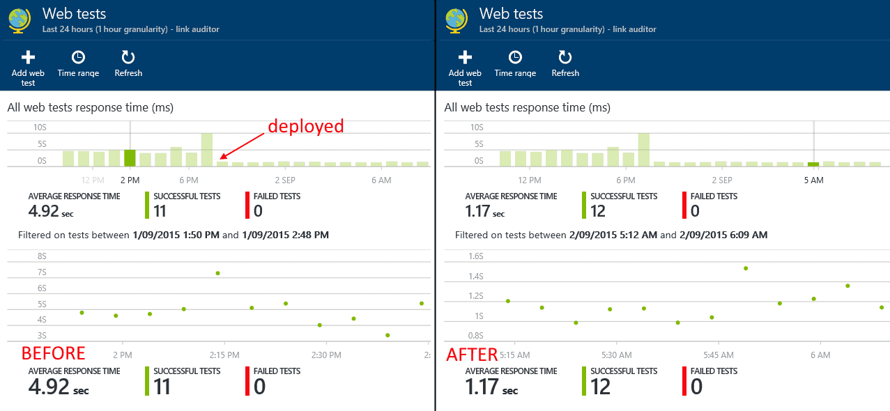 Good example - You can clearly see the point where a fix to production improved the initial page load You have the ability to drill down into web test results, to get an overview of the response time of the resources on a page. This can help discover if certain resources are slowing the response time.