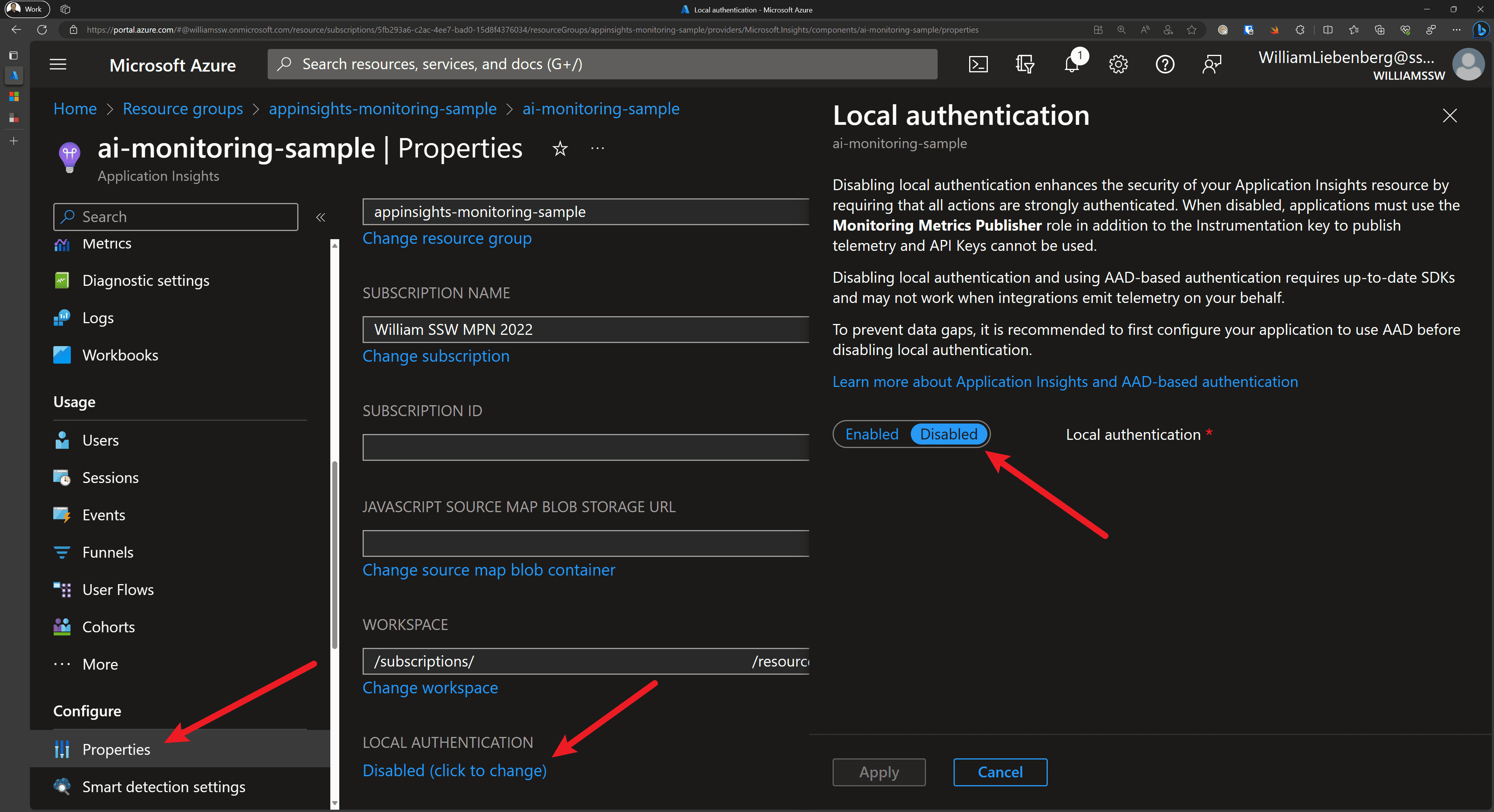DisableLocalAuthtotrue.resource appInsights 'Microsoft.Insights/components@2020-02-02' = { name: appInsightsName location: location kind: 'web' tags: tags properties: { Application_Type: 'web' Flow_Type: 'Bluefield' Request_Source: 'rest' WorkspaceResourceId: logAnalyticsWorkspace.id DisableLocalAuth: true // Enables RBAC } }Figure: Disable Local Authentication to enable Enhanced Security for Application Insights using Bicep