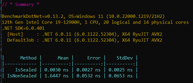 Figure: Performance results show arrays with sealed types show improved performance compared to arrays with non-sealed types Skip hierarchy checks of inheritance in runtime for is/as cast operations