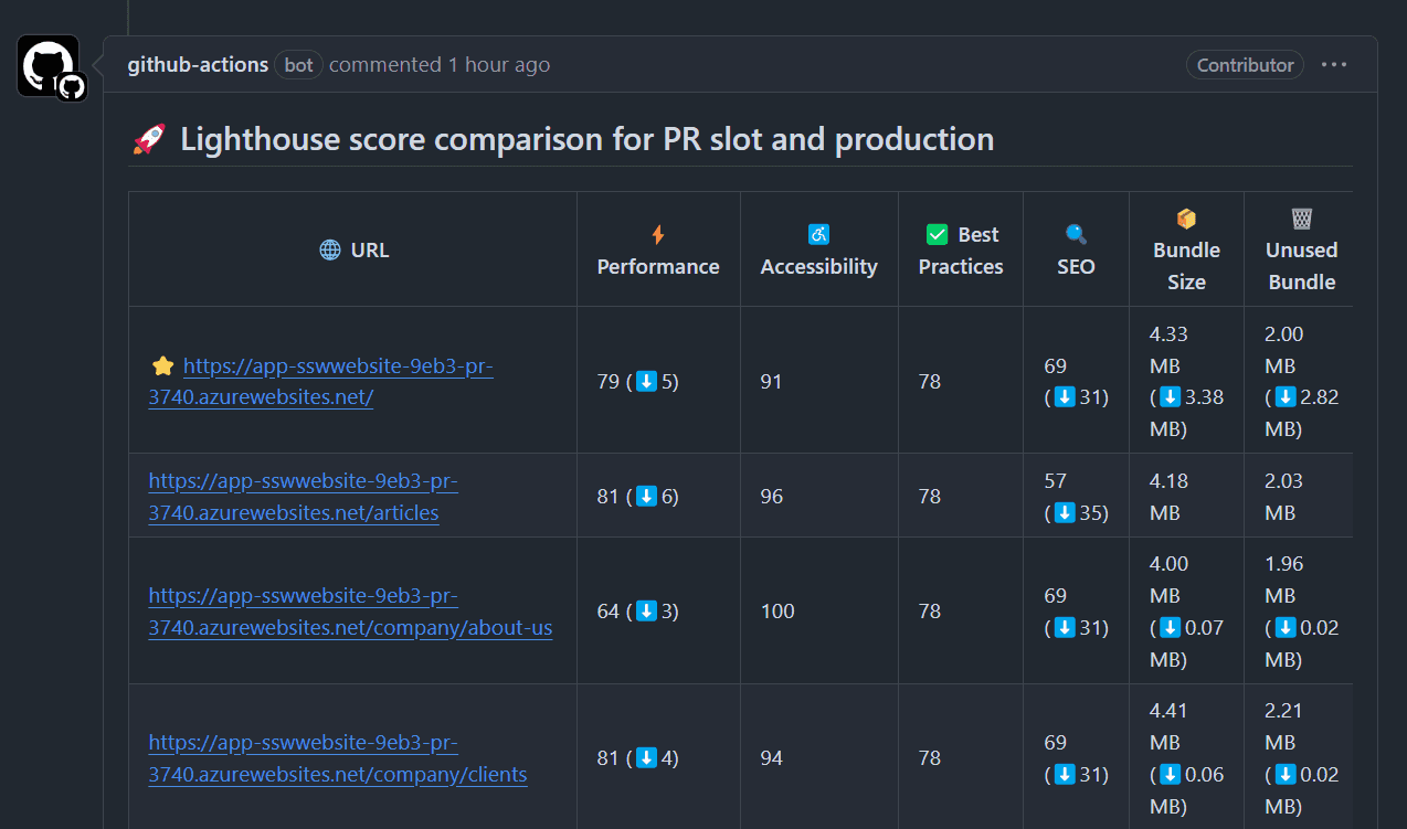 It is essential to compare PR performance against the production environment. This ensures that new changes do not introduce performance drops that can negatively impact user experience, SEO rankings, or best practices.