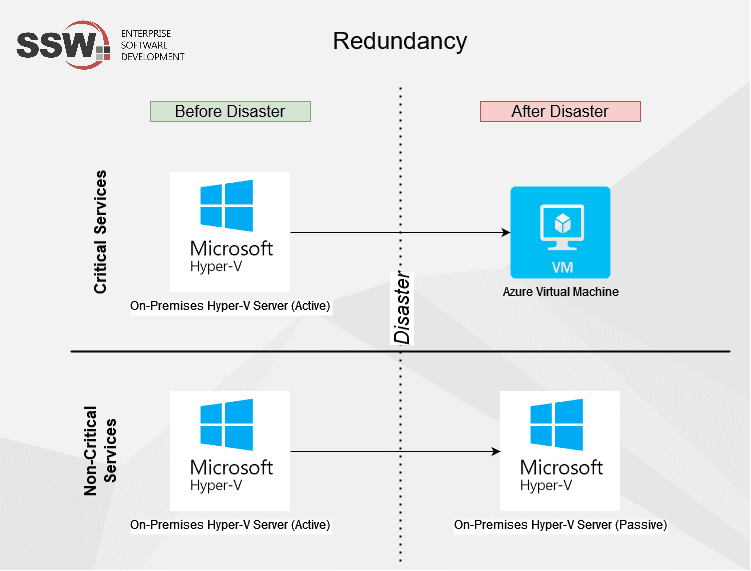 - Hyper-V Redundancy - Two (or more) physical server blades as Hyper-V hosts part of the same failover cluster - if one blade goes down, VMs are automatically migrated to another host in the cluster