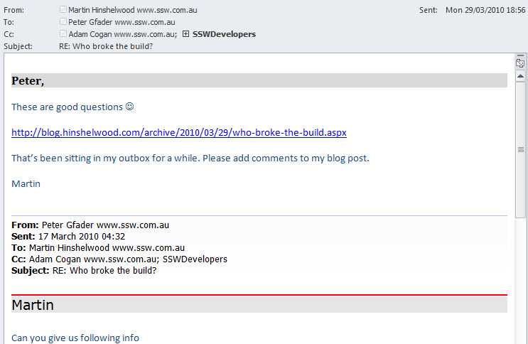 Figure: Bad example - This is just an email and is hidden from all those outside of the recipients. Any answer here would only be of use to those on the list. What if someone new to the company had the issue or someone outside of the company?