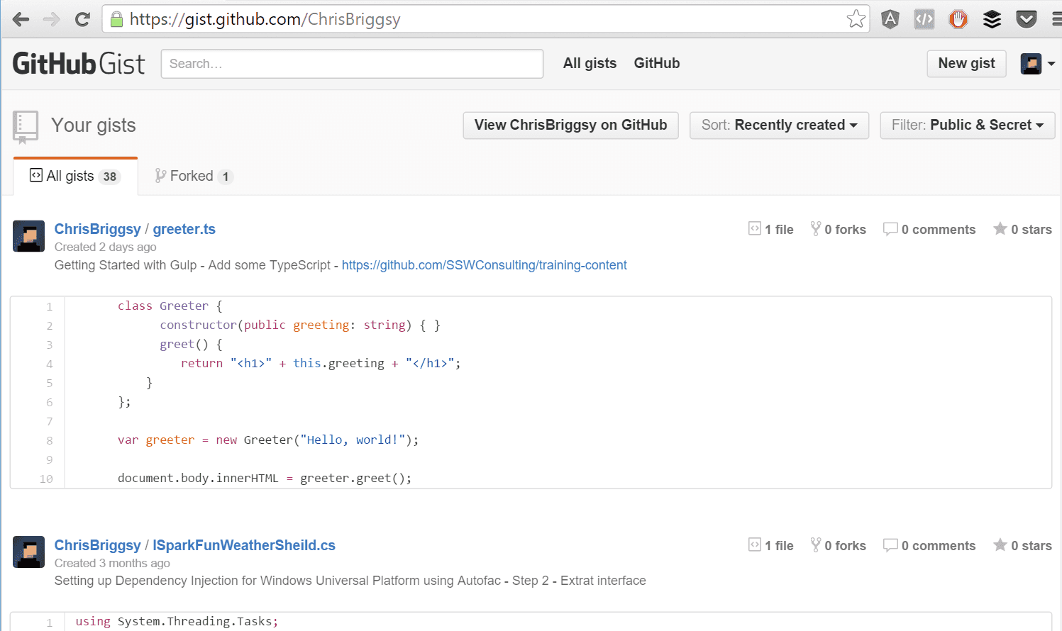 Upon editing an already published Gist, the previous versions are preserved. As to be expected with any good source control, you can use the built-in diff engine to highlight clearly the changes between any two versions of a single Gist. This sounds like it can get out of hand quickly, but you can easily view all your Gists by heading to https://gist.github.com/username/.