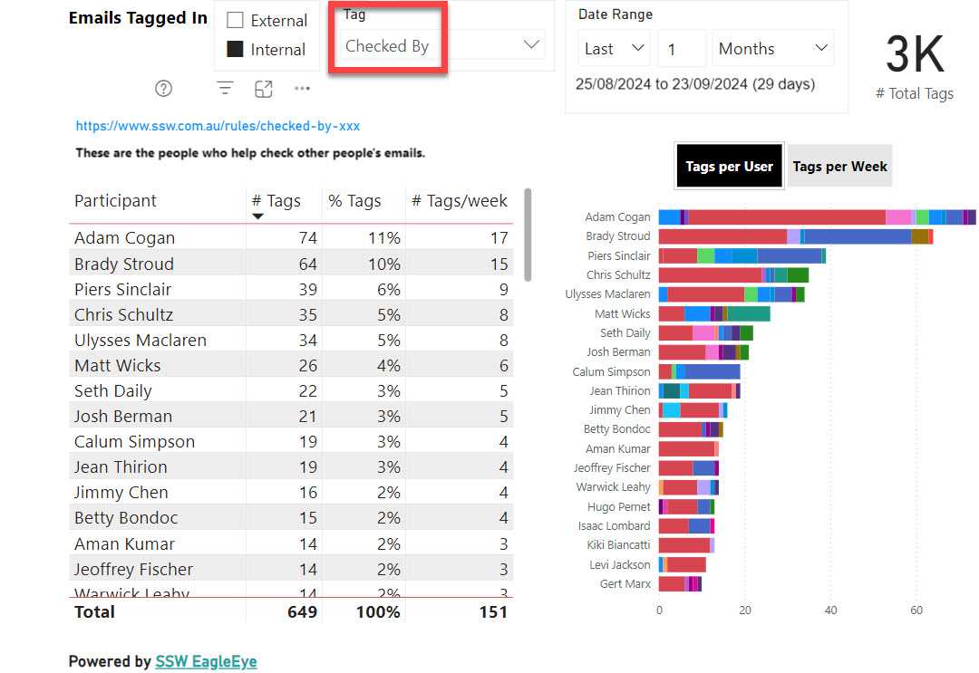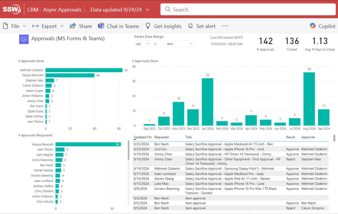 Figure: Instead of using an approvals app, this is a report tracking how many approvals people do from company emails (unstructured data). Each person needs to first manually look up who is the employee responsible for approving the email The tool is called SSW EagleEye.