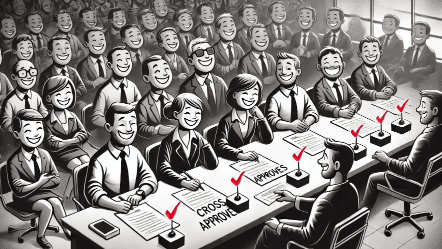 In small companies, a single key stakeholder often approves everything, ensuring alignment with the organizational vision and strategy. However, as the company grows, this can lead to bottlenecks - or "approval hell". One approach that addresses this is to have multiple people responsible for a specific approval. This ensures a clearly communicated system for cross-authorization.