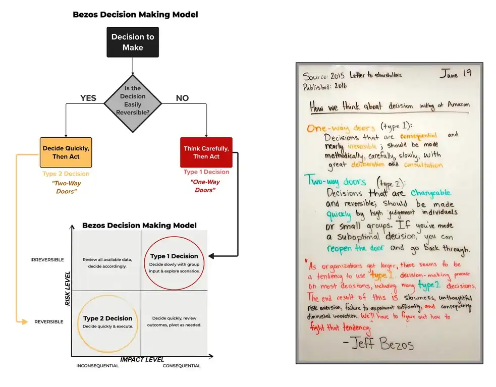 Figure: Jeff Bezos decision tree Type 1 decisions 🟥 - Think carefully, then act
