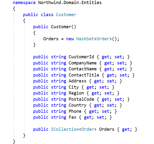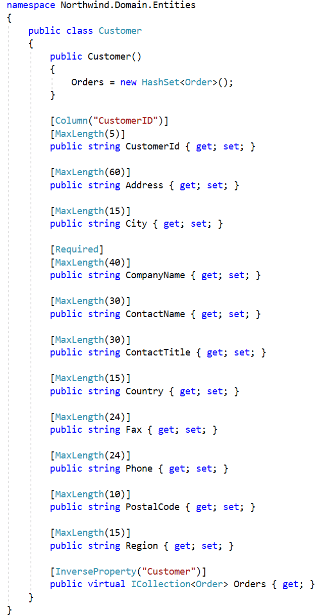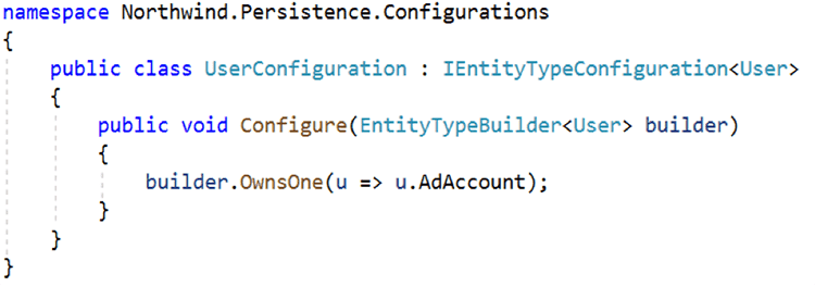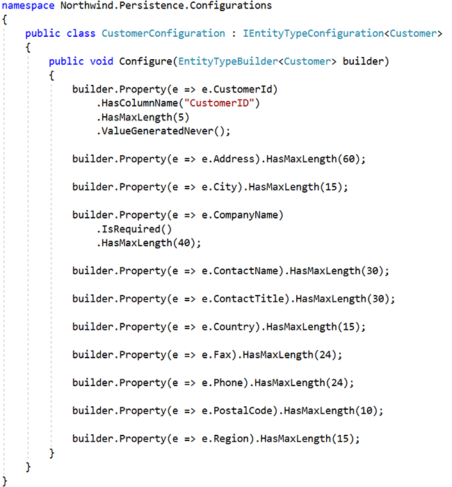 As you can see in the above example, the domain is cluttered with data annotations. If the data access technology changes, we will likely need to change all entities as all entities will have data annotations. In the following example, we will remove the data annotations from the entity and instead use a special configuration type:
