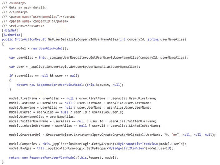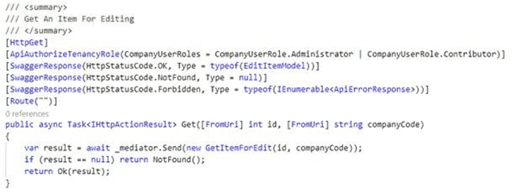 Figure: Good example - MediatR simplifies the dependencies injected into the controller. The incoming web request is simply mapped directly to a MediatR request that orchestrates all the logic for this operation. The implementation and dependencies needed to complete “GetItemForEdit” are free to change without needing to change the controller class When using MediatR within an ASP.NET Controller it is typical to see actions such as the following: