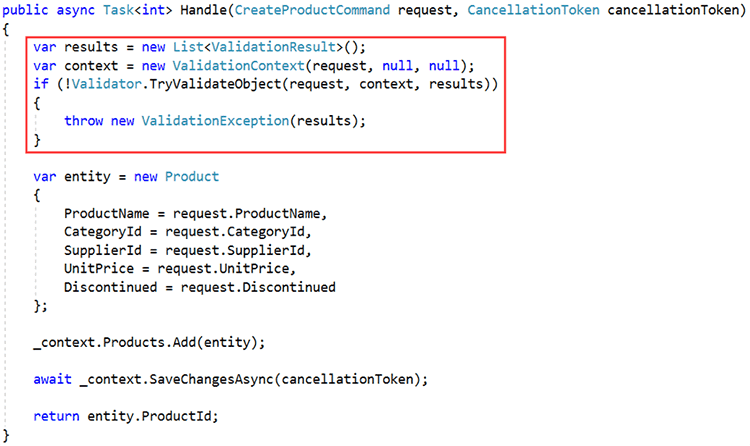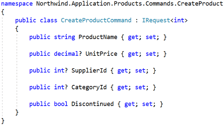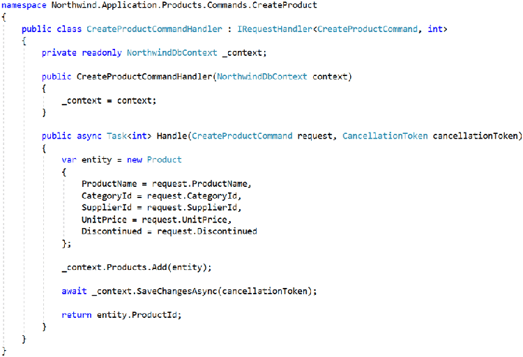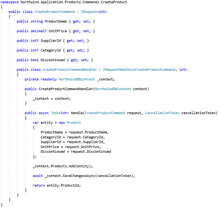 In the above implementation, the request handler is cleanly separated from the request. However, this separation results in reducing discoverability of the handler. For example, a developer looking at the action in this first figure might be interested in the logic behind the command. So, they press F12 to go to the definition and can see the request (CreateProductCommand), but not the logic since it is contained within the request handler (CreateProductCommandHandler). The developer must then navigate to the handler using Solution Explorer or some keyboard wizardry. This is assuming that the developer is familiar with the design, and knows that there is an underlying request handler that contains the logic of interest. We can avoid these problems and improve discoverability by instead using the following approach: