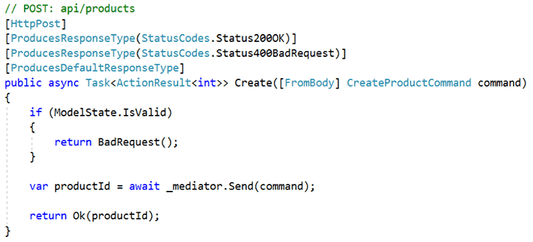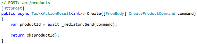 Figure: A Typical ASP.NET Controller using Mediator In the above example, the API contains a Create action that includes a CreateProductCommand parameter. This command is a request to create a new product, and the request is associated with an underlying request handler. The request is sent using MediatR with the method call _mediator.Send(command). MediatR will match the request to the associated request handler and return the response (if any). In a typical implementation, the request and request handler would be contained within separate files: